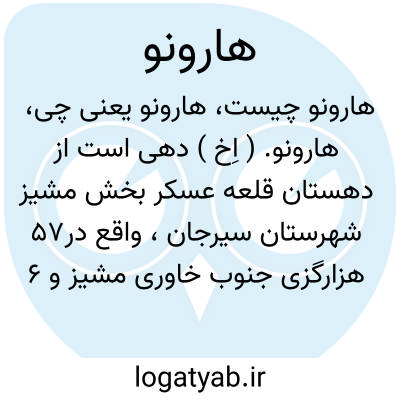 هارونو. ( اِخ ) دهی است از دهستان قلعه عسکر بخش مشیز شهرستان سیرجان، واقع در57 هزارگزی جنوب خاوری مشیز و 6 هزارگزی خاور راه فرعی بافت به کرمان. ناحیه ای است کوهستانی، سردسیر و دارای 243 تن سکنه شیعه فارسی زبان است. آب آن از قنات و محصول آن غلات و حبوبات و شغل اهالی زراعت است. راه مالرو دارد. ( از فرهنگ جغرافیایی ایران ج 8 ).