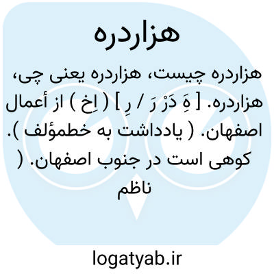 هزاردره. [ هَِ دَرْ رَ / رِ ] ( اِخ ) از أعمال اصفهان. ( یادداشت به خطمؤلف ). کوهی است در جنوب اصفهان. ( ناظم الاطباء ).