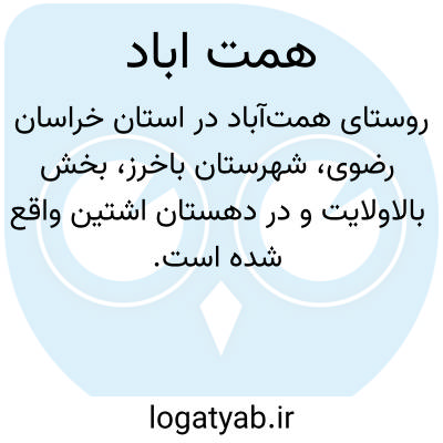 همت آباد (باخرز). همت آباد ( باخرز )، روستایی از توابع بخش بالاولایت شهرستان باخرز در استان خراسان رضوی ایران است. همت آباد مرکز دهستان اشتین بخش بالا ولایت شهرستان باخرز است. روستای همت آباد بیش از ۲۱ شهید تقدیم انقلاب اسلامی کرده است و روستایی ولایت مدار با مردمی خونگرم می باشد