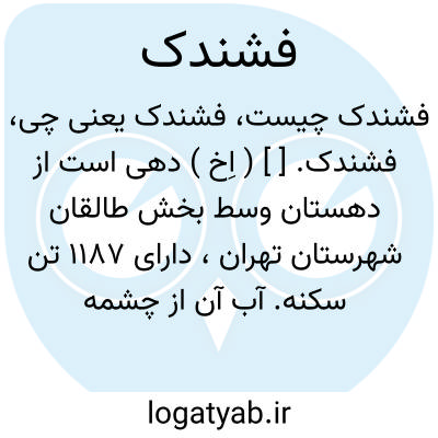 فشندک. [ ] ( اِخ ) دهی است از دهستان وسط بخش طالقان شهرستان تهران، دارای 1187 تن سکنه. آب آن از چشمه سارها و محصول عمده اش غله دیم و آبی، سیب زمینی، بنشن و میوه است. ( از فرهنگ جغرافیایی ایران ج 1 ).