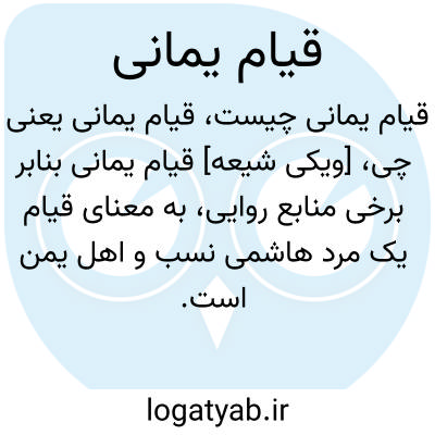 [ویکی شیعه] قیام یمانی بنابر برخی منابع روایی، به معنای قیام یک مرد هاشمی نسب و اهل یمن است. این رویداد در روایات از نشانه های حتمی ظهور امام مهدی(عج) معرفی شده است. به نقل برخی روایات یمانی از نسل امام حسین(ع) است و نسبش به زید بن علی می رسد و طبق برخی دیگر از روایات، از نسل امام حسن مجتبی(ع) است. او همزمان با ظهور سفیانی و سید خراسانی در یک روز و یک ماه و یک سال قیام می کند.