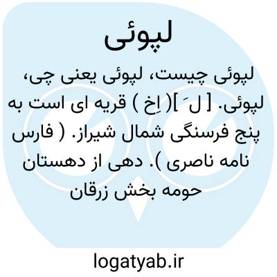 لپوئی. [ ل َ ]( اِخ ) قریه ای است به پنج فرسنگی شمال شیراز. ( فارس نامه ناصری ). دهی از دهستان حومه بخش زرقان شهرستان شیراز، واقع در ششهزارگزی باختر زرقان و ششهزارگزی راه شوسه اصفهان به شیراز. جلگه، معتدل، مالاریایی. دارای 1220 تن سکنه. شیعه فارسی زبان. آب آن از چاه. محصول آنجا غلات و حبوبات. شغل اهالی زراعت و باغبانی و قالی بافی است. ( از فرهنگ جغرافیایی ایران ج 7 ).
