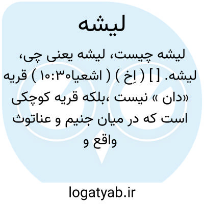 لیشه. [ ] ( اِخ ) ( اشعیا10:30 ) قریه «دان » نیست،بلکه قریه کوچکی است که در میان جنیم و عناتوث واقع و ولتر گمان دارد همان عیسویه است که به مسافت دو میل به شمال اورشلیم واقع است. ( قاموس کتاب مقدس ).