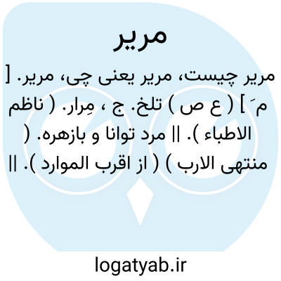 مریر. [ م َ ] ( ع ص ) تلخ. ج، مِرار. ( ناظم الاطباء ). || مرد توانا و بازهره. ( منتهی الارب ) ( از اقرب الموارد ). || محکم و استوار: أمر مریر. ( از اقرب الموارد ). || رسن سخت تافته و دراز باریک. ( از منتهی الارب ). رسن که لطیف و نرم و دراز و سخت تافته باشد. ( از اقرب الموارد ). || زمین خالی و فارغ از هرچیزی. || ( اِ ) عزیمت و آهنگ. ( منتهی الارب ) ( از اقرب الموارد ). || گویند استمرّ مریره؛ یعنی بعد از سستی و ضعف، توانا و قوی گشت. ( از اقرب الموارد ). ج، مَرائر. ( منتهی الارب ) ( از اقرب الموارد ).