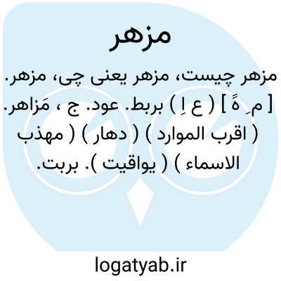 ( اسم ) ۱ - از سازهایی که مشخصات آن کاملا معلوم نیست: بعضی از نویسندگان مزهر را نام دیگری برای عود ذکر کرده اند و عده ای هم آنرا نوعی از سازهای ضربی از قبیل طبل یا دنبک دانسته اند در حالیکه در نظر عد. دیگر وجود سیم ( اوتار ) در این ساز محقق بوده است. زخم. مطربان صلای صبوح در زبانهای مزهر اندازد. ( خاقانی )