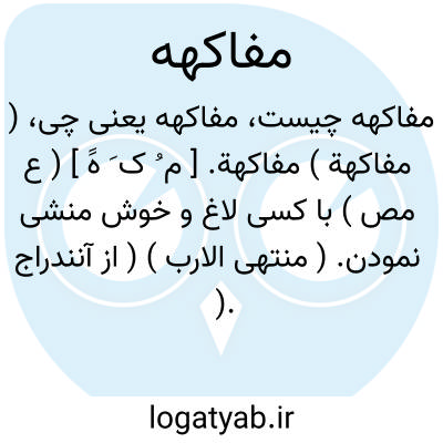 مفاکهه. [ م ُ ک َ / ک ِ هََ / هَِ ] ( از ع، اِمص ) مفاکهة. مطایبه. ممازحه. با یکدیگر مزاح کردن. ( یادداشت به خط مرحوم دهخدا ). || ( اِمص ) طیبت. شوخی. مزاح. خوش طبعی. خوش منشی. لاغ. ( یادداشت به خط مرحوم دهخدا ): و درد زدگی فراق مشاهدات را به نور اجتماع و فاکهه مفاکهه شریف امید تشفی می دارد. ( منشآت خاقانی چ محمد روشن ص 142 ). و حدیث و سخن این مخنث در آفاق فاش و مشهور شد، بعضی مسخرگان کرمان از نشاط مفاکهه و محاوره او عزیمت زیارت مصمم کردند. ( ترجمه محاسن اصفهان ). و رجوع به مفاکهة شود.