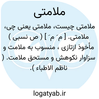 ( صفت ) ۱ - منسوب به ملامت ۲ - پیرو ملامتیه: [ از پس کنیت سگی چیست بشهر نام ما? درد کش ملامتی سیم کش قلندری. ] ( خاقانی. سج. ۴۲۸ ) توضیح در عربی تائ مصدری و نظایر آن از آخر کلمات ملحق به یائ نسبت حذف شود و [ ملامی ] گویند اما در فارسی ملامتی و اباحتی بسیار استعمال شود.