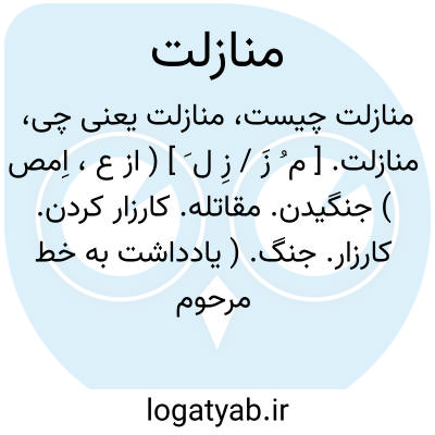 منازلت. [ م ُ زَ / زِ ل َ ] ( از ع، اِمص ) جنگیدن. مقاتله. کارزار کردن. کارزار. جنگ. ( یادداشت به خط مرحوم دهخدا ). منازلة: مگر از طول ایام و امتداد مقام به ستوه آیند و از آن مقاتلت و منازلت روی بتابند. ( ترجمه تاریخ یمینی چ 1 تهران ص 350 ). || ( اصطلاح تصوف )نزول معنی از غیب و آمادگی دل برای قبول آن. ( فهرست اصطلاحات و نوادر لغات ترجمه رساله قشیریه چ فروزانفر ): مقام آن بود که بنده به منازلت متحقق گردد بدو، به لونی از طلب و جهد و تکلف. ( ترجمه رساله قشیریه چ فروزانفر ص 91 ). رجوع به منازلات شود.