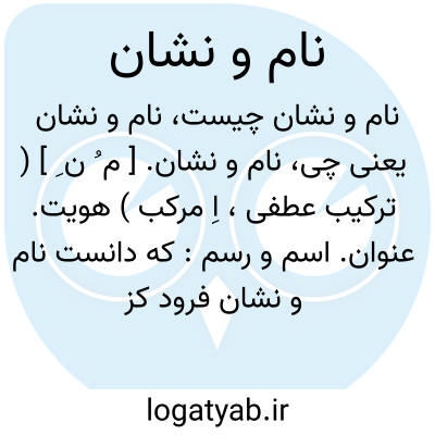 (اسم ) ۱ - اسم ورسم عنوان:[...ونام و نشان خود اظهارکرد ] یابه نام ونشان رسیدن.صاحب اسم ورسم شدن شخصیتی بهم رساندن.۲ - سجل: [ نام ونشان هرکس وسیله شناختن اوست ]