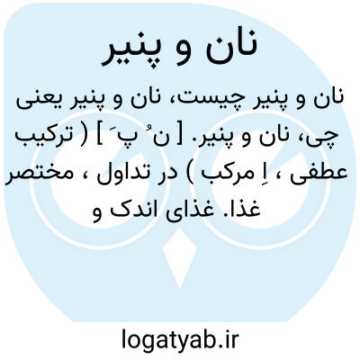 نان و پنیر. [ ن ُ پ َ ] ( ترکیب عطفی، اِ مرکب ) در تداول، مختصر غذا. غذای اندک و مختصر. غذائی ساده و به دور از تکلف: نان و پنیری با هم خوردیم؛ مختصر غذائی صرف کردیم، غذای ساده بی تکلفی خوردیم.