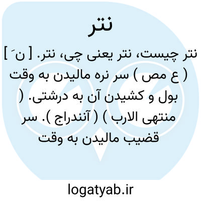 نتر. [ ن َ ] ( ع مص ) سر نره مالیدن به وقت بول و کشیدن آن به درشتی. ( منتهی الارب ) ( آنندراج ). سر قضیب مالیدن به وقت شاش کردن و کشیدن آن به درشتی. ( فرهنگ خطی ). سرِ اندام بمالیدن. ( تاج المصادر بیهقی ). سرِ اندام بمالیدن به وقت بول کردن و به عنف کشیدن. ( زوزنی ). || شکافتن جامه را به انگشتان و به دندان. ( منتهی الارب ) ( آنندراج ) ( از اقرب الموارد ) ( از ناظم الاطباء ) ( از معجم متن اللغة ) ( از المنجد ). || سخت کشیدن چیزی را. ( از اقرب الموارد ) ( از ناظم الاطباء ). به سختی کشیدن. ( از معجم متن اللغة ). جذب به شدت. ( از المنجد ). به عنف کشیدن. ( تاج المصادر بیهقی ). کشیدن به درشتی. || به قوت کشیدن کمان را. ( از معجم متن اللغة ). کشیدن کمان را. ( المنجد ) ( اقرب الموارد ). || سخت نیزه زدن. ( از اقرب الموارد ) ( از ناظم الاطباء ) ( از معجم متن اللغة ) ( از المنجد ). || سست و خوار شدن. ( منتهی الارب ) ( آنندراج ) ( از معجم متن اللغة ). || تکیه کردن در راه رفتن، چنانکه گویی کسی او را می کشد. ( اقرب الموارد ) ( از معجم متن اللغة ). || سخن درشت و زشت گفتن. ( منتهی الارب ) ( آنندراج ) ( از ناظم الاطباء ). شدید و غلیظ کردن کلام را. ( از اقرب الموارد ) ( از المنجد ). زشت گفتن در سخن با غضب و حماقت. ( از معجم متن اللغة ). || درشتی نمودن. ( منتهی الارب ) ( آنندراج ). تشدد در کار. ( از معجم متن اللغة ). || ربودن. ( منتهی الارب ) ( آنندراج ) ( از معجم متن اللغة ). ربودن چیزی را. ( اقرب الموارد ) ( از ناظم الاطباء ) ( از المنجد ). || نیزه ربوده زدن. ( منتهی الارب ) ( آنندراج ) ( از معجم متن اللغة ). نیزه را از کسی ربودن زدن. ( فرهنگ خطی ). || ( ص ) ضعیف در کار. || ( اِمص ) عنف. وهن: قابله بنتر؛ بعنف. ( از اقرب الموارد ).