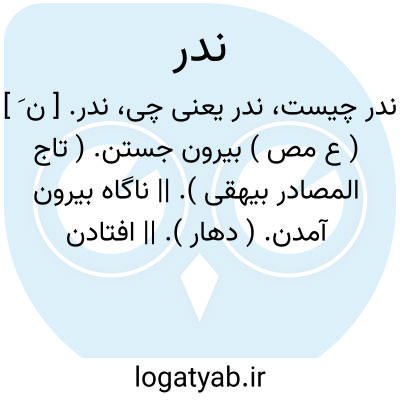 ندر. [ ن َ ] ( ع مص ) بیرون جستن. ( تاج المصادر بیهقی ). || ناگاه بیرون آمدن. ( دهار ). || افتادن چیزی از درون چیزی و آشکار شدن آن. ( از المنجد ) ( از اقرب الموارد ). ندور. ( المنجد ). || زایل شدن چیزی از موضع خود. || خارج شدن کسی از بین قوم خود. || برآمدن خوص درخت یا سبز شدن درخت. || برآمدن برگ گیاه. || کمیاب شدن چیزی. ( از المنجد ) ( از اقرب الموارد ). و اسم از آن نَدرَة و نُدرَة است. ( از اقرب الموارد ). || پیشی جستن مرد در علم و فضل. ( از المنجد ) ( از اقرب الموارد ). || تیز دادن. ( از اقرب الموارد ). || مردن. || آزمودن. ندور. ( از المنجد ) ( از اقرب الموارد ). || بدانستن. ( زوزنی ). || بیافتن. ( تاج المصادر بیهقی ). در تمام معانی رجوع به ندور شود. || ( ص ) نادر. ( المنجد ) ( اقرب الموارد ). شی ندر؛ نادر. وصف بالمصدر. ( اقرب الموارد ). رجوع به نادر شود.