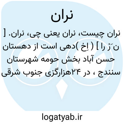 نران. [ ن َرْ را ] ( اِخ )دهی است از دهستان حسن آباد بخش حومه شهرستان سنندج، در 24هزارگزی جنوب شرقی سنندج و 6هزارگزی مشرق قصریان، در منطقه کوهستانی سردسیری واقع است و 600 تن سکنه دارد. آبش از چشمه، محصولش غلات، شغل اهالی زراعت و گله داری است. ( از فرهنگ جغرافیایی ایران ج 5 ).