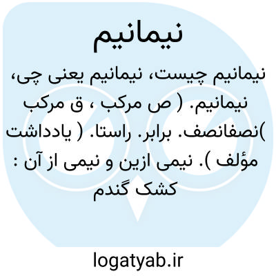نیمانیم. ( ص مرکب، ق مرکب )نصفانصف. برابر. راستا. ( یادداشت مؤلف ). نیمی ازین و نیمی از آن: کشک گندم و کشک جو نیمانیم با یک درم سنگ تخم بادیان. ( ذخیره خوارزمشاهی ). کشکاب از کشک و نخود پزند نیمانیم یا دو بهر کشک جو و یک بهر نخود. ( ذخیره خوارزمشاهی ). اگر شراب خواهد داد شرابی رقیق باید کرد یعنی آب بسیار باید کرد چنانکه نیمانیم باشد یعنی مناصفه. ( ذخیره خوارزمشاهی ).