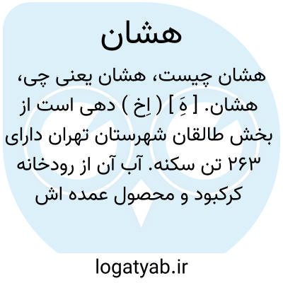 هشان. [ هَِ ] ( اِخ ) دهی است از بخش طالقان شهرستان تهران دارای 263 تن سکنه. آب آن از رودخانه کرکبود و محصول عمده اش غله، میوه و لبنیات است. ( از فرهنگ جغرافیائی ایران ج 1 ).