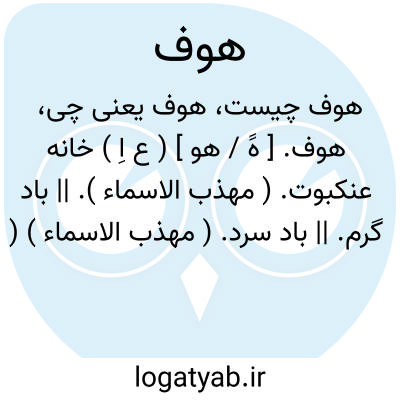 هوف. [ هََ / هو ] ( ع اِ ) خانه عنکبوت. ( مهذب الاسماء ). || باد گرم. || باد سرد. ( مهذب الاسماء ) ( منتهی الارب ) ( اقرب الموارد ) ( آنندراج ). از اضداد است. ( منتهی الارب ) ( اقرب الموارد ).