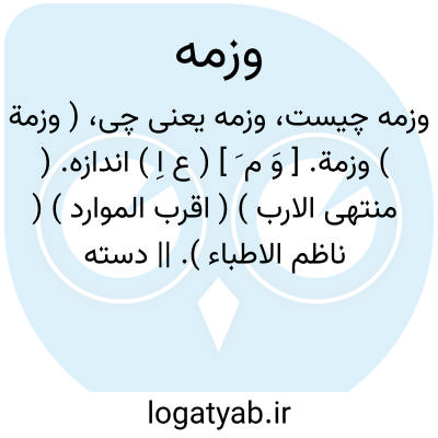 ( وزمة ) وزمة. [ وَ م َ ] ( ع اِ ) اندازه. ( منتهی الارب ) ( اقرب الموارد ) ( ناظم الاطباء ). || دسته سبزی تره. ( المنجد ). || ( مص ) اندکی زیان رسیدن در مال. ( ناظم الاطباء ) ( منتهی الارب ) ( اقرب الموارد ). و فعل آن به طور مجهول استعمال شود. ( منتهی الارب ). || چیز اندک را به سوی مثل آن گرد کردن. || رخنه کردن در چیزی. ( منتهی الارب ). || به شباروزی یک بار خوردن. ( منتهی الارب ) ( مهذب الاسماء ) ( ناظم الاطباء ). || بروی درافتادن در خوردن. ( منتهی الارب ) ( ناظم الاطباء ).