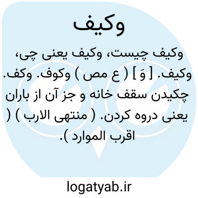 وکیف. [ وَ ] ( ع مص ) وکوف. وکف. چکیدن سقف خانه و جز آن از باران یعنی دروه کردن. ( منتهی الارب ) ( اقرب الموارد ). رجوع به وکوف و وکف شود. || قطره قطره جاری ساختن چشم اشک را و ابر باران را. ( منتهی الارب ) ( اقرب الموارد ). چکیدن سقف خانه و جز آن از باران یا دروا کردن. ( آنندراج ). چکیدن آب ازسقف و دلو و آنچ بدین ماند. ( تاج المصادر بیهقی ).