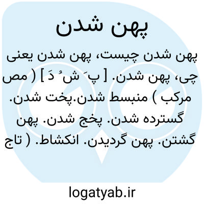( مصدر ) ۱- فراخ شدن وسیع گردانیدن. ۲- عریض شدن. ۳- پخت شدن گسترده شدن منبسط گردیدن.۴-نشستن از کاهلی: هر جا میرسد پهن میشود. یا پهن شدن روی زمین. یا پهن شدن نام کسی. مشهور شدن وی.