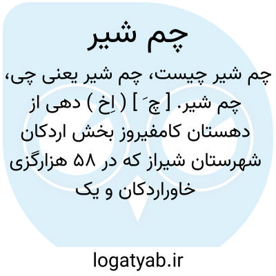 چم شیر. [ چ َ ] ( اِخ ) دهی از دهستان کامفیروز بخش اردکان شهرستان شیراز که در 58 هزارگزی خاوراردکان و یک هزارگزی راه فرعی خانیمان به پل خان واقع است. جلگه است با هوای معتدل و 71 تن سکنه دارد. آبش از رودخانه. محصولش غلات و برنج. شغل اهالی زراعت و راهش مالرو است. ( از فرهنگ جغرافیایی ایران ج 7 ).