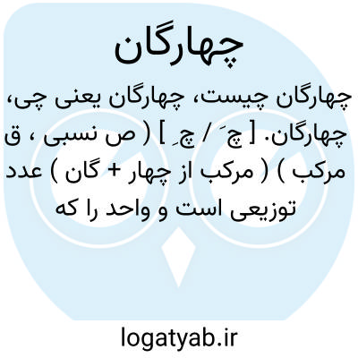 چهارگان. [ چ َ / چ ِ ] ( ص نسبی، ق مرکب ) ( مرکب از چهار + گان ) عدد توزیعی است و واحد را که چهارست به قسمتهای مساوی بخش کند. چهارچهار. رُباع؛ یعنی اربعةاربعة. ( منتهی الارب ). رُبَع ( از منتهی الارب ). چهار به چهار. || چهار در چهار. || چهار و چهار. ( ناظم الاطباء ).