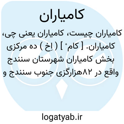 کامیاران. [ کام ْ ] ( اِخ ) نام یکی از بخش های شهرستان سنندج. خلاصه مشخصات جغرافیایی آن به شرح زیر است: حدود: از طرف شمال به بخش حومه سنندج از طرف جنوب به دهستان میان دربند بخش روانسر از خاور دهستان بیلوار بخش مرکزی کرمانشاه و بخش سنقر کلیایی از باختر بخش پاوه از شمال باختر بخش زرآب از شهرستان سنندج وضع کلی: منطقه ای است کوهستانی رودخانه کاروددر محل شمال بخش از خاور به طرف باختر جاری، راه شوسه کرمانشاه به سنندج از وسط بخش یک هزارگزی جنوب کامیاران میگذرد راه اکثر قراء بخش مالرو است. محصولاتش غلات، لبنیات است. این بخش از چهار دهستان به شرح زیر تشکیل شده و شرح هر یک در جای خود داده شده است.