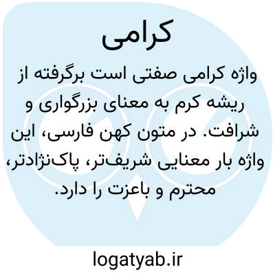 ( صفت ) منسوب به کرام پیرو کرامیه: [... دیگر گروه متکلمانند از معتزله و کرامی... ]. ( جامع الحکمتین )