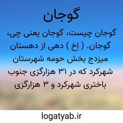 گوجان. ( اِخ ) دهی از دهستان میزدج بخش حومه شهرستان شهرکرد که در 31 هزارگزی جنوب باختری شهرکرد و 3 هزارگزی راه نارسیان به باباحیدر واقع شده است. کوهستانی و هوای آن معتدل و سکنه آن 1302 تن است. آب آن از چشمه و قنات و رودخانه سراب تأمین میشود. محصول آن غلات و شغل اهالی زراعت و راه آن ماشین رو است. ( از فرهنگ جغرافیایی ایران ج 10 ).