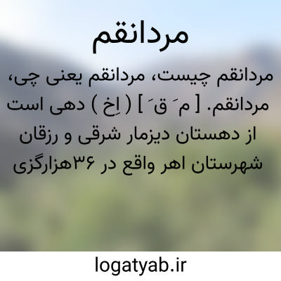 مردانقم. [ م َ ق َ ] ( اِخ ) دهی است از دهستان دیزمار شرقی و رزقان شهرستان اهر واقع در 36هزارگزی ورزقان و 34هزارگزی راه تبریز به اهر در منطقه کوهستانی گرمسیرواقع و دارای 639 تن سکنه است. آبش از رودخانه مردانقم و چشمه است. ( از فرهنگ جغرافیایی ایران ج 4 ).