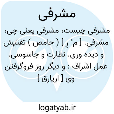مشرفی. [ م ُ رِ ] ( حامص ) تفتیش و دیده وری. نظارت و جاسوسی. عمل اشراف: و دیگر روز فروگرفتن وی [ اریارق ] سلطان پیروز وزیری خادم را و بوسعید مشرف را که امروزبرجای است و به رباط کندی میباشد و هنوز مشرفی نداده بودند... به سرای اریارق فرستاد. ( تاریخ بیهقی چ ادیب ص 228 ). در آن روزگار با دبیری و مشاهره که داشت مشرفی غلامان سرایی برسم وی بود سخت پوشیده. ( تاریخ بیهقی چ ادیب ص 273 ). امیر مثال داد تا جمله مملکت را چهار مرد اختیار کنند مشرفی را. ( تاریخ بیهقی ).