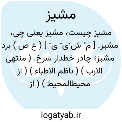 مشیز. [ م ُ ش َی ْ ی َ ] ( ع ص ) برد مشیز؛ چادر خطدار سرخ. ( منتهی الارب ) ( ناظم الاطباء ) ( از محیطالمحیط ) ( از اقرب الموارد ). راه راه. مخطط با راههای سرخ. ( یادداشت مؤلف ).
