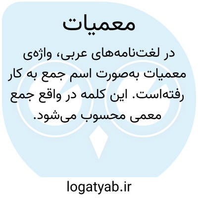 در لغتنامههای عربی، واژهی مَعْمِیات بهصورت اسم جمع به کار رفتهاست. این کلمه در واقع جمعِ مُعَمّیٰ محسوب میشود که خود از ریشهی «ع م ی» به معنای پوشاندن و نهفتن مشتق شدهاست. در کاربردهای ادبی و کهن، مَعْمِیات به معانی پوشیده، پیچیده و مباحثی است که به صورت رمز یا ایهام بیان شدهاند. این واژه معمولاً در اشاره به کلامی به کار میرود که معنای آن مستور بوده و نیاز به تأمل و دقت بیشتری برای درک دارد. برای مطالعهی تفصیلی و دستیابی به اطلاعات بیشتر در مورد این واژه و مشتقات آن، همچون مُعَمّی، مراجعه به مدخل اصلی آن در کتب لغت و فرهنگنامههای معتبر فارسی و عربی توصیه میشود.