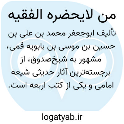 [ویکی شیعه] من لایحضره الفقیه (کتاب). کتاب مَن لایحْضُرُه الفَقیه، ( به معنای کتاب کسی که در محضر فقیه نیست) دومین کتاب از کتب اربعه امامیه؛ اثر شیخ صدوق (د ۳۸۱ ق). این کتاب که مجموعه ای در حدیث است، با هدف گردآوری احادیث صحیح و موثق تألیف شده است تا پاسخگوی نیازهای شرعی کسانی باشد که به فقیه دسترسی ندارند.