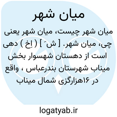 میان شهر. [ ش َ ] ( اِخ ) دهی است از دهستان شهسوار بخش میناب شهرستان بندرعباس، واقع در 16هزارگزی شمال میناب با 100 تن سکنه. آب آن از رودخانه و راه آن ماشین رو است. ( از فرهنگ جغرافیائی ایران ج 8 ).