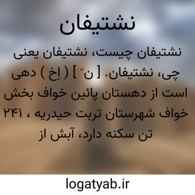 نشتیفان. [ ن َ ] ( اِخ ) دهی است از دهستان پائین خواف بخش خواف شهرستان تربت حیدریه، 241 تن سکنه دارد، آبش از قنات و محصولش غلات و شغل اهالی زراعت و گله داری است. ( از فرهنگ جغرافیائی ایران ج 9 ).