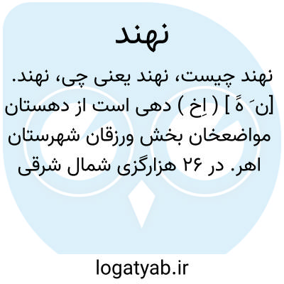 نهند. [ن َ هََ ] ( اِخ ) دهی است از دهستان مواضعخان بخش ورزقان شهرستان اهر. در 26 هزارگزی شمال شرقی تبریز و 12 هزارگزی جاده اهر به تبریز، در منطقه کوهستانی معتدل هوایی واقع و دارای 1100 تن سکنه است. آبش از چشمه و رود نهند، محصولش غلات و حبوبات، شغل اهالی زراعت و گله داری است. ( از فرهنگ جغرافیائی ایران ج 4 ).