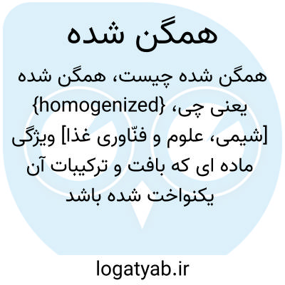 {homogenized} [شیمی، علوم و فنّاوری غذا] ویژگی ماده ای که بافت و ترکیبات آن یکنواخت شده باشد