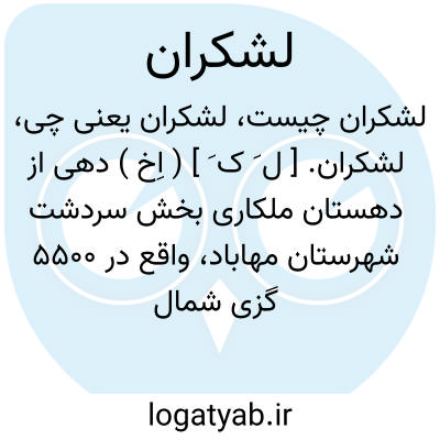 لشکران. [ ل َ ک َ ] ( اِخ ) دهی از دهستان کره سنی بخش سلماس شهرستان خوی واقع در 15 هزارگزی شمال باختری سلماس و 9500 گزی باختر شوسه سلماس به خوی کوهستانی، معتدل و مالاریائی. دارای 107 تن سکنه سنی. آب آن از چشمه و قنات. محصول آنجا غلات. شغل اهالی زراعت و گله داری. صنایع دستی جاجیم بافی و راه آن مالرو است. ( از فرهنگ جغرافیایی ایران ج 4 ).