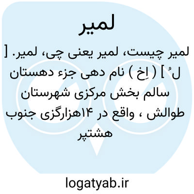 لمیر. [ ل ُ ] ( اِخ ) نام دهی جزء دهستان سالم بخش مرکزی شهرستان طوالش، واقع در 14هزارگزی جنوب هشتپر و طرفین شوسه انزلی به آستارا. جلگه، معتدل، مرطوب و مالاریائی و دارای 1520 تن سکنه. آب آن از رود کلاسیرا. محصول آنجا برنج، غلات و لبنیات. شغل اهالی زراعت و گله داری و صنایع دستی آنان شال و جوراب بافی است و در تابستان مردم به ییلاق بشم میروند. دبستانی دارد و از سه محله بالا و پائین واله ده تشکیل شده است. ( از فرهنگ جغرافیایی ایران ج 2 ).