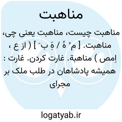 مناهبت. [ م ُ هََ / هَِ ب َ ] ( از ع، اِمص ) مناهبة. غارت کردن. غارت: همیشه پادشاهان در طلب ملک بر مجرای این عادت رفته اند... و از یکدیگر به مغالبت و مناهبت فراگرفته.( مرزبان نامه چ قزوینی ص 182 ). رجوع به مناهبة شود.