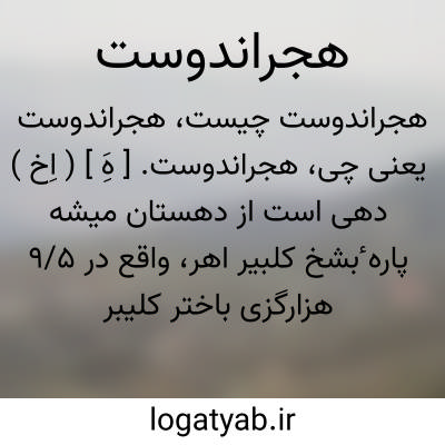 هجراندوست. [ هَِ ] ( اِخ ) دهی است از دهستان میشه پاره ٔبشخ کلبیر اهر، واقع در 9/5 هزارگزی باختر کلیبر و 10 هزارگزی راه شوسه اهر به کلیبر. ناحیه ای است کوهستانی، معتدل و دارای 421 تن سکنه میباشد. از دو رشته چشمه مشروق میشود. محصول آن غلات است. اهالی به زراعت و گله داری گذران میکنند. صنعت دستی آنان گلیم بافی است راه مالرو دارد. ( فرهنگ جغرافیایی ایران ج 4 ).