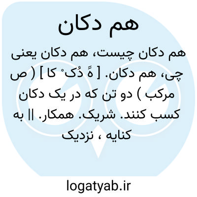 هم دکان. [ هََ دُک ْ کا ] ( ص مرکب ) دو تن که در یک دکان کسب کنند. شریک. همکار. || به کنایه، نزدیک و دوست صمیم: