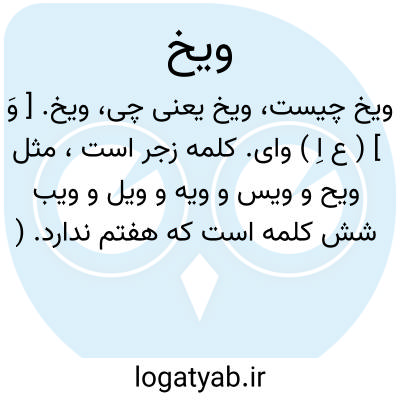 ویخ. [ وَ ] ( ع اِ ) وای. کلمه زجر است، مثل ویح و ویس و ویه و ویل و ویب شش کلمه است که هفتم ندارد. ( آنندراج ) ( ناظم الاطباء ). مثل ویح است دروزن و معنی. ( از اقرب الموارد ). رجوع به ویح شود.