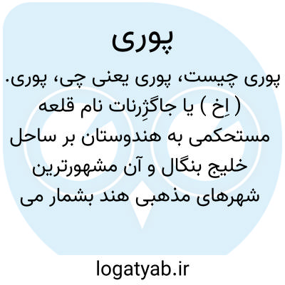 پوری. ( اِخ ) یا جاگژِرنات نام قلعه مستحکمی به هندوستان بر ساحل خلیج بنگال و آن مشهورترین شهرهای مذهبی هند بشمار می رود و دارای چهل هزار تن سکنه است و تعداد زائرینی که در دو عید مذهبی باین شهر آیند به یک میلیون بالغ شود و این جمعیت در این اعیاد بدسته های بسیار عظیم منقسم گردد و در شهر بگردش درآید در حالی که مجسمه رب النوعی را پیشاپیش برند و شاید پوریان که در لغتنامه های فارسی نام شهر پور ( پور رای کنوج ( قنوج ) بوده است ) دانسته شده همین شهر باشد.
