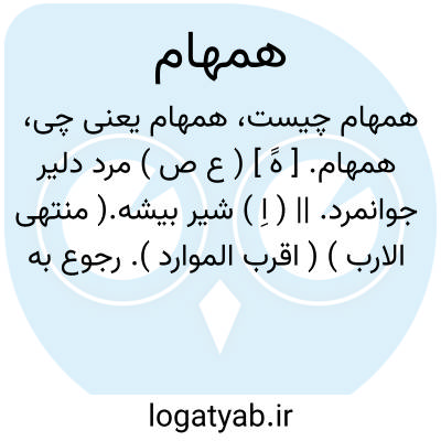 همهام. [ هََ ] ( ع ص ) مرد دلیر جوانمرد. || ( اِ ) شیر بیشه.( منتهی الارب ) ( اقرب الموارد ). رجوع به همهوم شود.