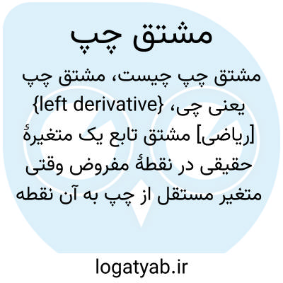 {left derivative} [ریاضی] مشتق تابع یک متغیرۀ حقیقی در نقطۀ مفروض وقتی متغیر مستقل از چپ به آن نقطه میل کند