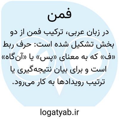 فمن. [ ف َ م َ] ( ع حرف + اسم ) ( از: «فََ» ربطی + من، موصول ) پس کسی که. پس آنکه: فمن یعمل مثقال ذرة شراًیره. ( یادداشت مؤلف ).