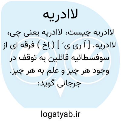 لاادریه. [ اَ ری ی َ ] ( اِخ ) فرقه ای از سوفسطائیه قائلین به توقف در وجود هر چیز و علم به هر چیز. جرجانی گوید: هم الذین ینکرون العلم بثبوت شی ٔو لاثبوته و یزعمون انه شاک و شاک فی انه شاک و هلم جرا. ( تعریفات ). گروهی هستند از فرقه سوفسطائیة و شرح آن در ضمن معنی سوفسطائیة بیاید انشأاﷲ تعالی. ( کشاف اصطلاحات الفنون ). شکاکین. ( دُزی ). مرتابین.