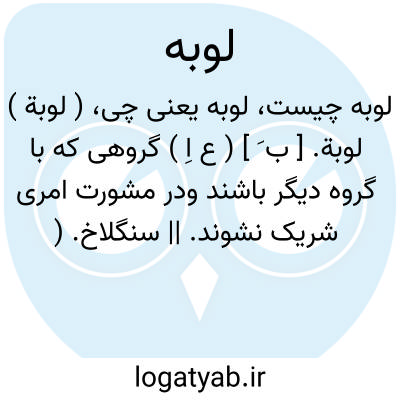 ( لوبة ) لوبة. [ ب َ ] ( ع اِ ) گروهی که با گروه دیگر باشند ودر مشورت امری شریک نشوند. || سنگلاخ. ( منتهی الارب ) ( مهذب الاسماء ). سنگستان سنگ سیاه. ( منتخب اللغات ). ج، لوب. || سیاهان. الواحد لوبی. ( مهذب الاسماء ). ابوعبیدة گوید: لوبة و نوبة بالضم فیهما، الحرّة و هی الارض التی البستها حجارة سود منه قیل للاسود و کذا نوبی ای منسوب الیها. ( منتهی الارب ).