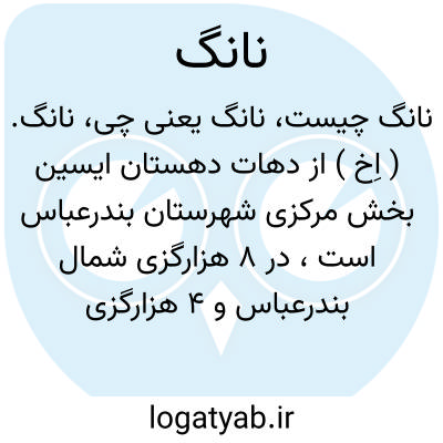 نانگ. ( اِخ ) از دهات دهستان ایسین بخش مرکزی شهرستان بندرعباس است، در 8 هزارگزی شمال بندرعباس و 4 هزارگزی مشرق راه شوسه کرمان به بندرعباس. در جلگه گرمسیری واقع است و558 تن سکنه دارد. آبش از قنات و محصولش غلات و خرماو شغل اهالی زراعت است. راه مالرو دارد. مزرعه چوچ جزء این ده است. ( از فرهنگ جغرافیایی ایران ج 8 ).
